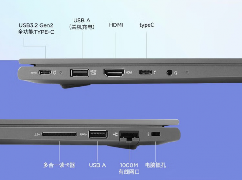 作為一臺(tái)面向主流商用市場(chǎng)的筆記本,聯(lián)想昭陽X5-14采用了全場(chǎng)景功能接口,擁有4個(gè)USB接口(含全功能Type-C*2,USB-A*2),HDMI接口和標(biāo)準(zhǔn)RJ45、MicroSD讀卡器,能夠輕松應(yīng)對(duì)多種擴(kuò)展與外設(shè)需求場(chǎng)景。在便攜性方面,其厚度薄至16.9mm,重量?jī)H為1.38kg,非常方便攜帶外出,適用于不同商用場(chǎng)景下的辦公需求。