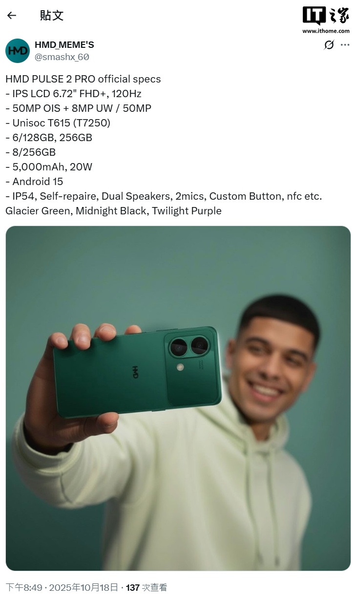 10 月 18 日消息,消息人士 @smashx_60 今日在 X 平臺發(fā)文,曝光 HMD Pulse 2 Pro 手機(jī)的詳細(xì)規(guī)格。
