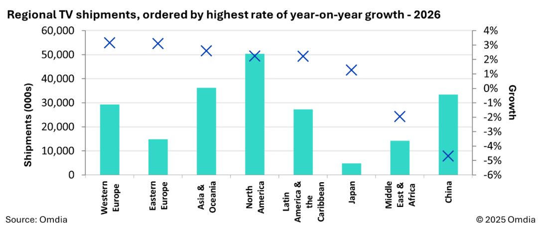 預(yù)計 2026 年增長最快的市場將出現(xiàn)在歐洲,其中西歐電視出貨量預(yù)計增長 3.2%,東歐出貨量預(yù)計增長 3.1%。作為賽事舉辦地的北美市場也有望實現(xiàn)穩(wěn)健增長,增幅約為 2.2%。