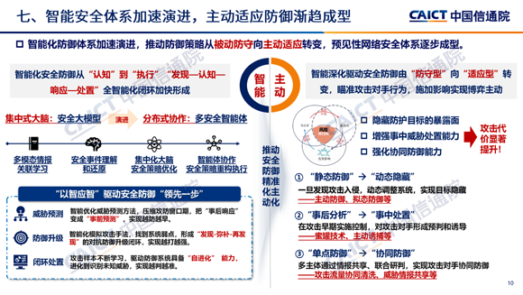 智能化安全防御從認知到執(zhí)行的全智能化閉環(huán)正加快形成。借助安全大模型實現(xiàn)多模態(tài)學習與事件理解,催生多安全智能體協(xié)作,完成策略重構(gòu),實現(xiàn)威脅預測、防御升級與閉環(huán)處理,“以智應智”驅(qū)動安全防御“領(lǐng)先一步”。