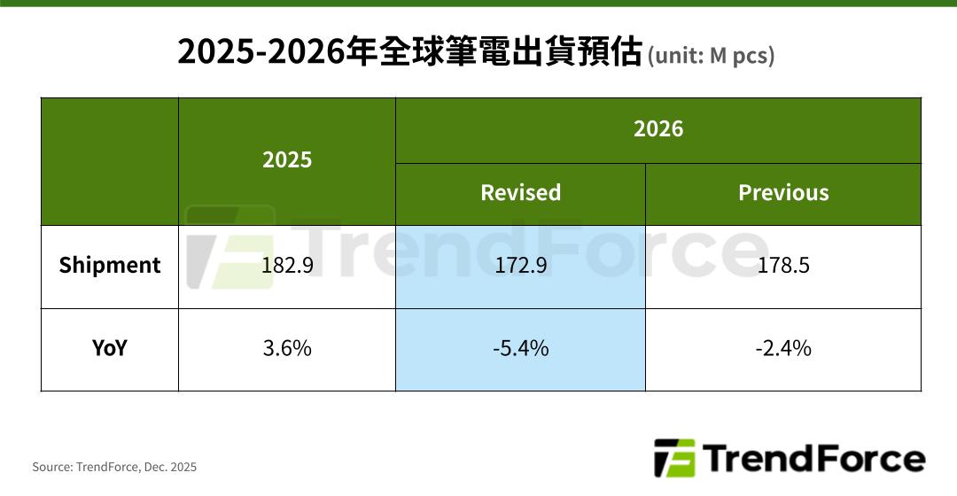 TrendForce 再度下調(diào) 2026 年全球筆記本電腦出貨預(yù)測至同比減少 5.4%