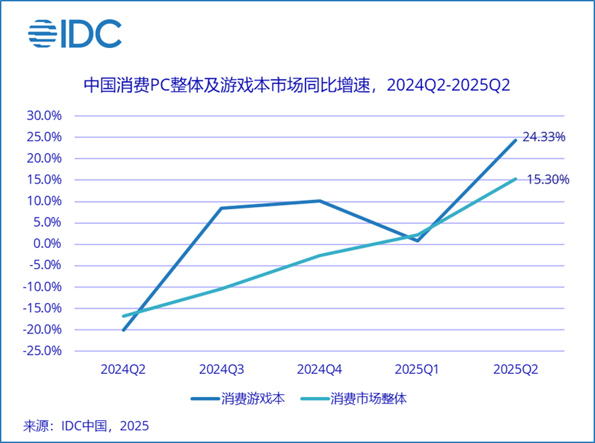 2025 年第二季度,消費市場游戲本同比增速達到 24.3%,顯著高于整體消費 PC 市場,成為拉動消費 PC 市場的關(guān)鍵因素。