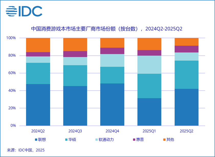 IDC 季度出貨量市場跟蹤報告顯示,聯(lián)想在消費級游戲本市場持續(xù)穩(wěn)居榜首,2025 年第二季度市場份額達 42.0%;華碩憑“ROG”和“天選”系列品牌產(chǎn)品表現(xiàn)強勁,市場份額快速提升,占比 32.1% 位列第二。