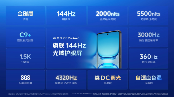 屏幕顯示方面,iQOO Z10 Turbo+ 搭載旗艦 144Hz 光域護(hù)眼屏,采用華星旗艦 C9+ 發(fā)光器件,支持2000nit 全局最大亮度和 4400nit 25% APL(多場(chǎng)景)局部峰值亮度,即便在強(qiáng)光環(huán)境下仍能保持清晰可視性。4320Hz超高頻PWM調(diào)光技術(shù)與類DC調(diào)光的結(jié)合,兼顧護(hù)眼效能與視覺(jué)舒適度。3000Hz瞬時(shí)觸控采樣率則為射擊類游戲提供精準(zhǔn)操作保障,實(shí)現(xiàn)"手眼同步"的競(jìng)技體驗(yàn)。
