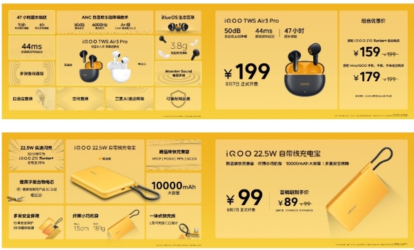 “KPL 推薦耳機(jī)”iQOO TWS Air3 Pro 同臺(tái)登場(chǎng),具備"星耀黃"與"星鉆白"兩款配色,帶來(lái) 50dB 多模式降噪、44ms 全鏈路游戲低延遲、47 小時(shí)最長(zhǎng)續(xù)航(搭配耳機(jī)盒)以及 3.8g 輕巧佩戴,為消費(fèi)者帶來(lái)輕松聆聽(tīng)的嶄新選擇。iQOO TWS Air3 Pro 到手價(jià) 199 元起,搭配 vivo / iQOO 手機(jī)購(gòu)買(mǎi)更優(yōu)惠。同時(shí)開(kāi)售的 iQOO 22.5W 自帶線充電寶到手價(jià) 99 元,首銷期到手價(jià) 89 元。