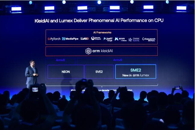 •  開發(fā)者可借助 KleidiAI 調(diào)用 SME2 技術(shù)帶來的性能優(yōu)勢;目前 KleidiAI 已集成至所有主流移動(dòng)操作系統(tǒng)及 AI 框架中,包括 PyTorch ExecuTorch、谷歌 LiteRT、阿里巴巴 MNN 及微軟 ONNX Runtime。