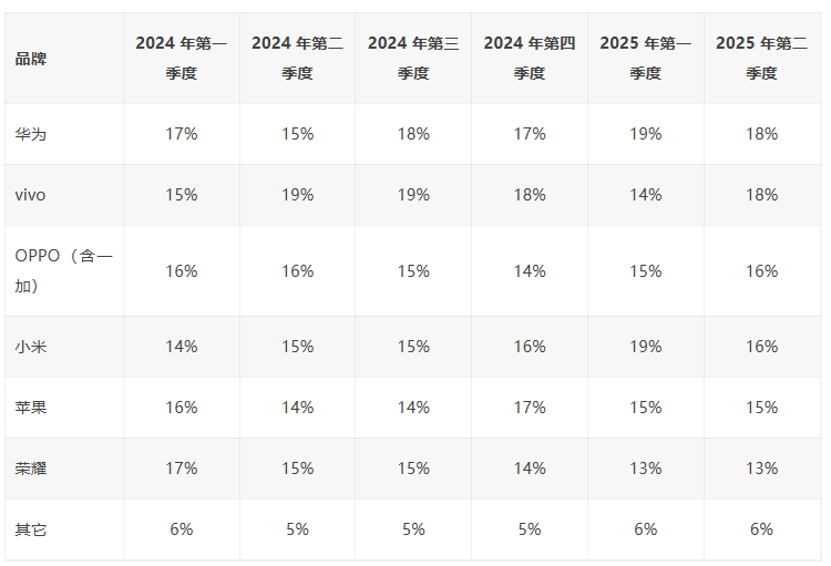 CounterPoint 報告 2025Q2 中國手機出貨量:華為、vivo 均占 18%、OPPO、小米均占 16%