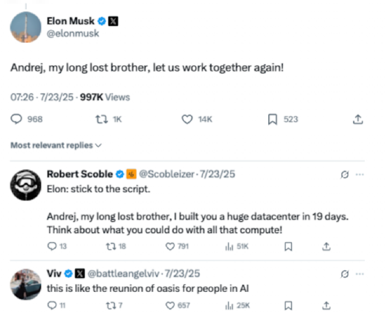 馬斯克對頂級人才有多謙遜?為了請?zhí)厮估癆utopilot業(yè)務(wù)負(fù)責(zé)人卡巴奇(Andej Karpathy)回來,馬斯克甚至公開稱卡巴奇是“自己失散多年的兄弟”,懇請他回來和自己一道共事。這或許是他最謙卑主動的一刻,僅次于對特朗普總統(tǒng)的“直男之愛”。