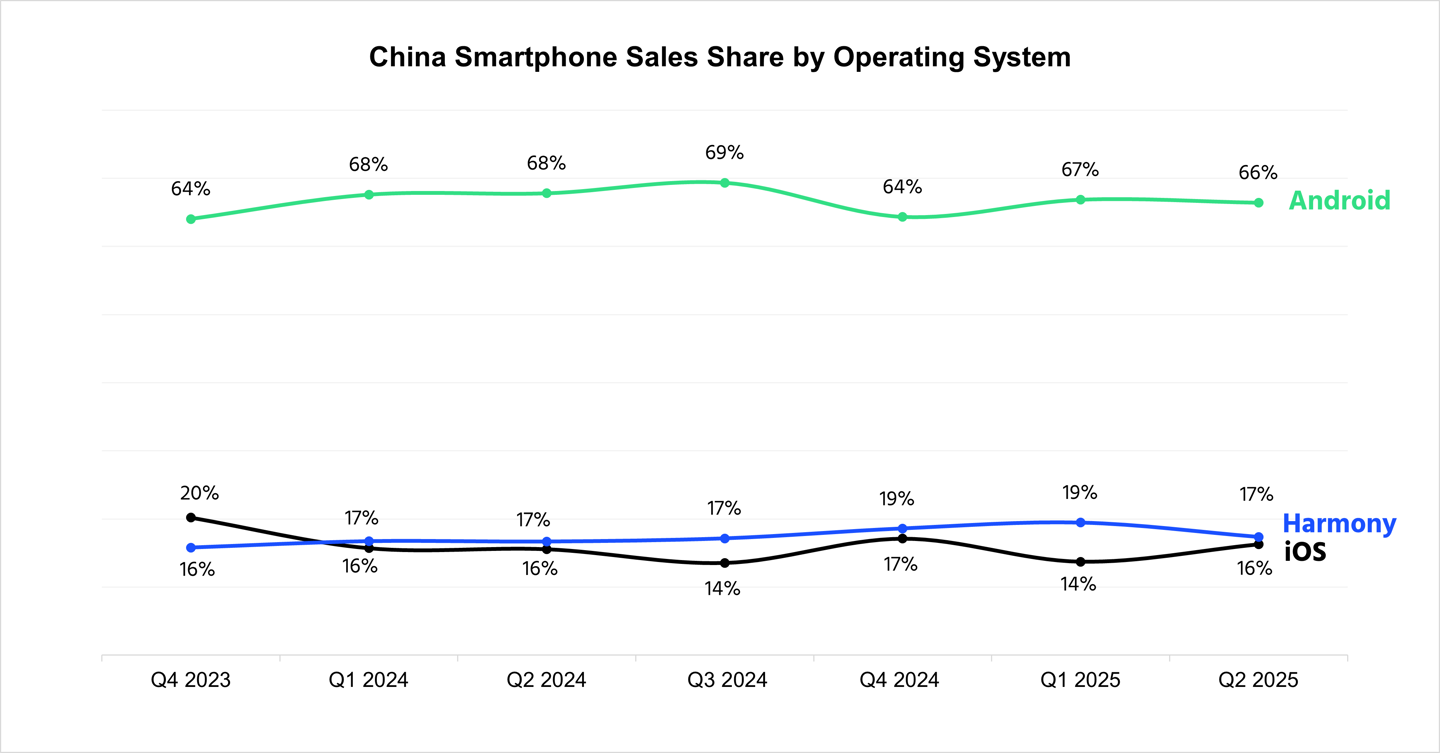 CounterPoint 報(bào)告中國手機(jī)系統(tǒng)份額:華為鴻蒙連續(xù) 6 個季度超蘋果 iOS 穩(wěn)居第二