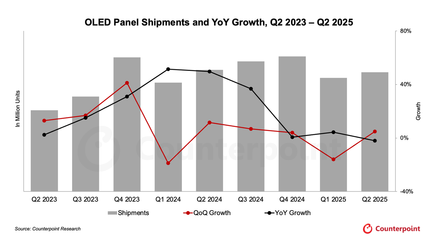 CounterPoint 報(bào)告 2025Q2 全球 OLED 面板出貨量:中國(guó) OLED 面板正加速滲透全球市場(chǎng)