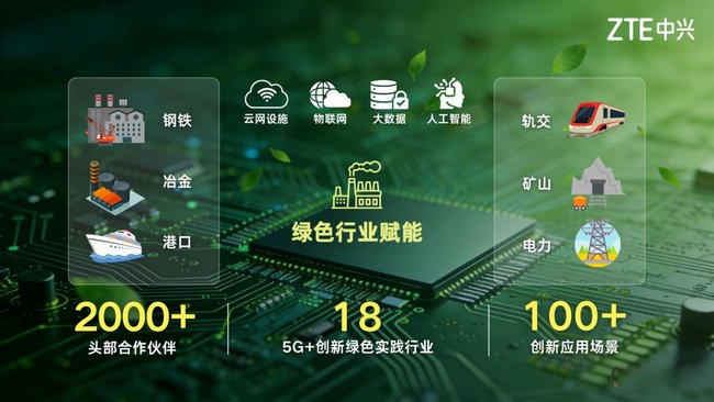 在綠色行業(yè)賦能方面,中興通訊通過云網(wǎng)設(shè)施、物聯(lián)網(wǎng)、大數(shù)據(jù)、人工智能等一系列先進(jìn)技術(shù)與傳統(tǒng)產(chǎn)業(yè)結(jié)合,實(shí)現(xiàn)發(fā)展與減排的雙贏,已攜手2000+個(gè)行業(yè)頭部合作伙伴在鋼鐵、冶金、電子制造、港口、軌交、礦山、電力等18個(gè)行業(yè)廣泛開展5G+創(chuàng)新綠色實(shí)踐,打造了100多個(gè)創(chuàng)新應(yīng)用場景。