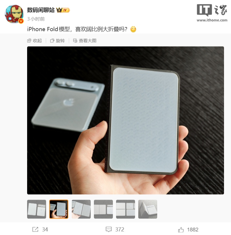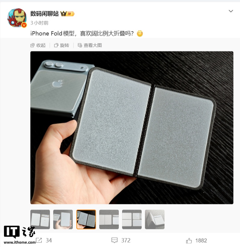 博主 @數(shù)碼閑聊站 今日曬出了 iPhone Fold 手機(jī)的模型,可以看到機(jī)身的外觀設(shè)計(jì)采用闊比例 + 內(nèi)外雙屏