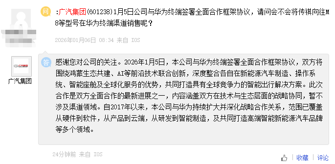 廣汽集團(tuán)稱,2026 年 1 月 5 日,本公司與華為終端簽署全面合作框架協(xié)議,雙方將圍繞鴻蒙生態(tài)共建、AI 等前沿技術(shù)聯(lián)合創(chuàng)新,深度整合各自在新能源汽車制造、操作系統(tǒng)、智能座艙及全球化服務(wù)的優(yōu)勢(shì),共同打造具有全球競(jìng)爭(zhēng)力的智能出行解決方案。