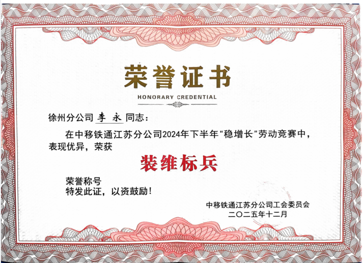 近日,從省分公司傳來(lái)捷報(bào):在江蘇鐵通2024年下半年“穩(wěn)增長(zhǎng)”勞動(dòng)競(jìng)賽中,徐州分公司員工李永、戚建分別榮獲“裝維標(biāo)兵”“工程先鋒”稱號(hào)。他們以卓越表現(xiàn)切實(shí)踐行了“淬鐵復(fù)興、創(chuàng)新向上”的企業(yè)精神,充分彰顯了“有旗必奪、有先必爭(zhēng)”的奮斗風(fēng)貌。讓我們以他們?yōu)榘駱,見賢思齊、接續(xù)奮斗!