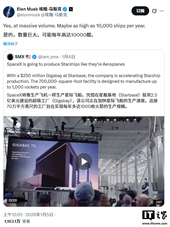 馬斯克轉(zhuǎn)發(fā)相關報道并配文證實:“沒錯,將進行大規(guī)模量產(chǎn),年產(chǎn)量或許能高達 10000 枚!