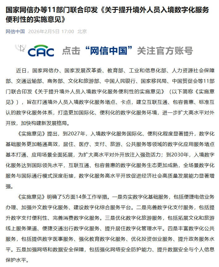 2 月 5 日消息,近日,國家網(wǎng)信辦、國家發(fā)展改革委、教育部、工業(yè)和信息化部、人力資源社會保障部、交通運輸部、商務(wù)部、文化和旅游部、中國人民銀行、國家移民局、中國貿(mào)促會等 11 部門聯(lián)合印發(fā)《關(guān)于提升境外人員入境數(shù)字化服務(wù)便利性的實施意見》(以下簡稱《實施意見》),旨在打通境外人員入境數(shù)字化服務(wù)堵點、卡點,建立互聯(lián)互通、包容普惠、標(biāo)準(zhǔn)互認(rèn)的數(shù)字化服務(wù)體系,打造更加國際化、便利化的數(shù)字化服務(wù)環(huán)境,進(jìn)一步擴大高水平對外開放,加快構(gòu)建新發(fā)展格局。