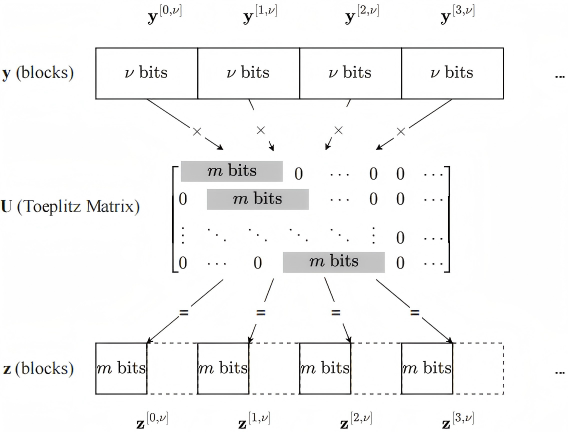 團(tuán)隊(duì)通過(guò)研究提出了首個(gè)針對(duì)HQC解封裝(Decapsulation)過(guò)程中DPA式的攻擊方法。通過(guò)統(tǒng)計(jì)分析,成功鎖定了HQC解密過(guò)程中的一個(gè)關(guān)鍵中間值v⊕(uy)的漢明重量。為了完成攻擊,設(shè)計(jì)了一種巧妙的“局部投影”(Toeplitz based Local Projections)方法,通過(guò)構(gòu)造特定的u多項(xiàng)式,使其在與密鑰y進(jìn)行乘法運(yùn)算時(shí),能起到類似“窗口”的作用。這種特殊的構(gòu)造確保了每一個(gè)小塊的輸出中間值,其依賴的密鑰位也被嚴(yán)格限制在一個(gè)對(duì)應(yīng)的小塊內(nèi)。通過(guò)這種方式,成功地將原本復(fù)雜的循環(huán)卷積問(wèn)題,分解為一系列可以獨(dú)立、并行DPA攻擊的“塊狀”問(wèn)題,極大地提高了攻擊的效率和可行性。