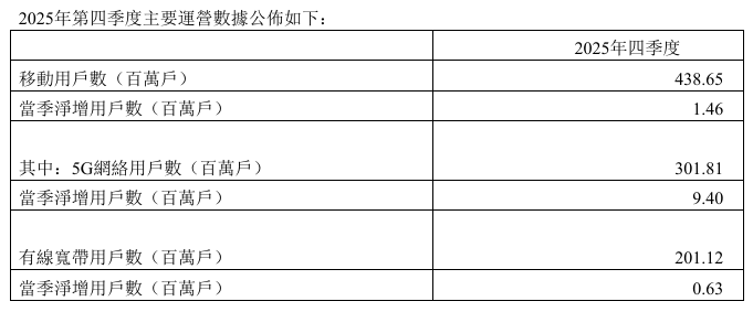 數(shù)據(jù)顯示,2025年第四季度,中國(guó)電信移動(dòng)用戶總數(shù)達(dá)到4.3865億戶,第四季度凈增用戶數(shù)146萬(wàn)戶;5G網(wǎng)絡(luò)用戶數(shù)達(dá)3.0181億戶,本季度凈增940萬(wàn)戶;有線寬帶累計(jì)用戶數(shù)達(dá)2.0112億戶,本季度凈增63萬(wàn)戶。