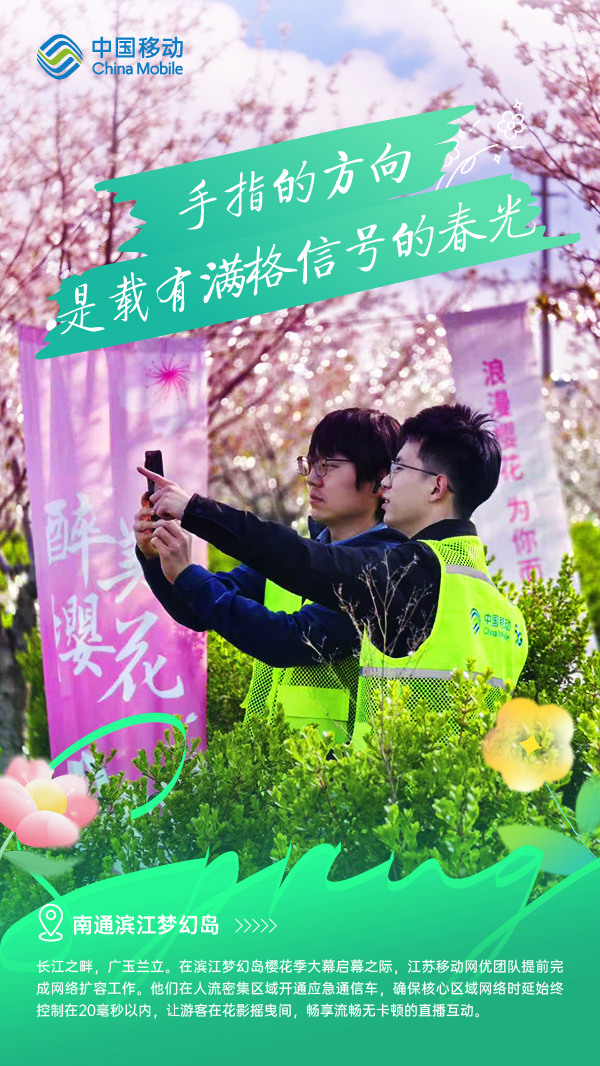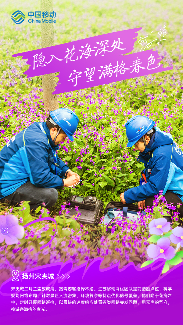 春日的花海之所以美好,是因為它歷經(jīng)了最后的料峭。每一次綻放,都離不開長久的積淀,通信網(wǎng)絡(luò)亦是如此。在每一處繁花盛開的地方,總有人比花期更早抵達(dá)。他們,正穿行于全省800余個踏青場景,用看不見的“信號之花”,把春天送抵每一個人身邊。讓我們跟隨移動網(wǎng)優(yōu)工程師的腳步,由南至北,走進江蘇的春日畫卷。
