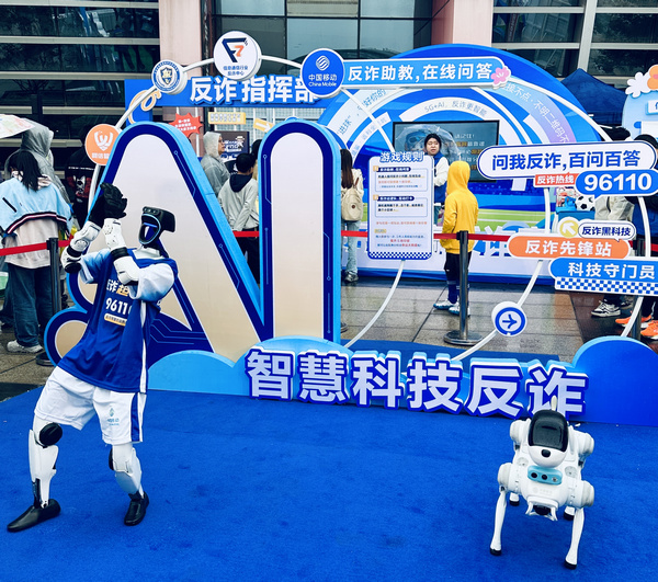反詐宣傳活動現(xiàn)場,靈動的機(jī)器狗在人群中穿梭,時而翻滾、時而作揖,引得孩子們爭相模仿,家長們紛紛舉起手機(jī)拍照。一旁的反詐智能機(jī)器人則成了“主考官”,隨機(jī)從海量反詐題庫中抽題“拷問”觀眾,還能實時識別語音答案、判斷對錯!八写蛑畏道焯柕募媛殻际窃p騙,對還是錯?”機(jī)器人問道!皩!”一位年輕球迷脫口而出!肮材悖饘α!”工作人員隨即將這位幸運(yùn)球迷引導(dǎo)至抽獎區(qū)試試手氣,引來一片歡呼。