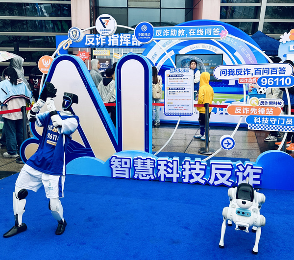 而翻滾、時(shí)而作揖,引得孩子們爭相模仿,家長們紛紛舉起手機(jī)拍照。一旁的反詐智能機(jī)器人則成了“主考官”,隨機(jī)從海量反詐題庫中抽題“拷問”球迷,不僅能實(shí)時(shí)識別語音答案、判斷對錯,還會為答對的球迷獻(xiàn)上一舞。