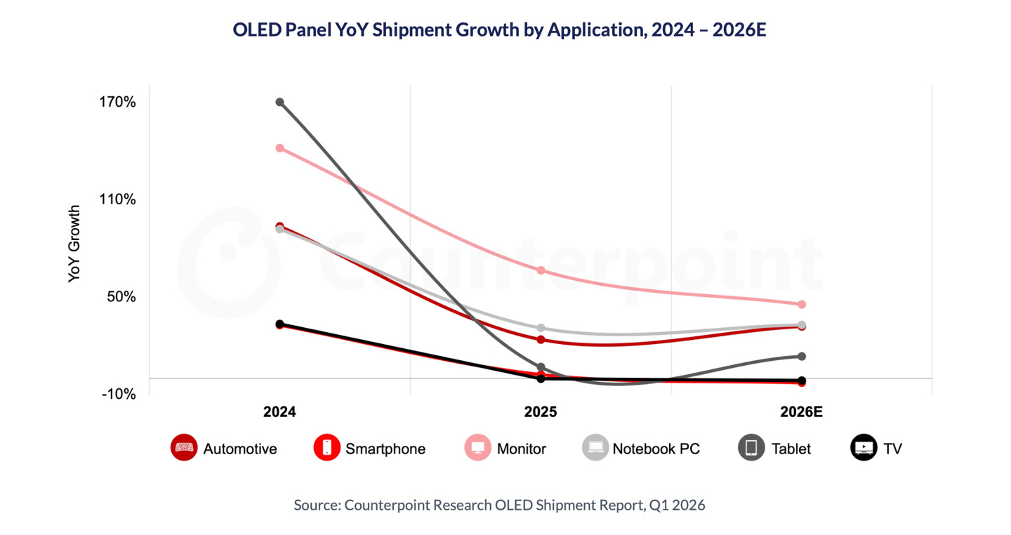 從整體 OLED 市場(chǎng)來(lái)看,2026 年出貨量預(yù)計(jì)將保持平穩(wěn)。顯示器市場(chǎng)預(yù)計(jì)增長(zhǎng) 45%,平板市場(chǎng)增長(zhǎng) 13%,汽車顯示領(lǐng)域也有所貢獻(xiàn)。