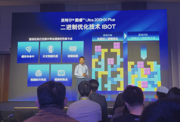 現(xiàn)場伴手禮口袋中多面色彩的魔方則似乎預(yù)示AI高靜游戲本Plus背后的芯片升級。英特爾在發(fā)布會現(xiàn)場用俄羅斯方塊來形象比喻新一代英特爾酷睿Ultra 200HX Plus處理器中二進制優(yōu)化技術(shù)(IBOT),高宇將在沒有優(yōu)化的處理器運行情況下,如同胡亂堆砌的不規(guī)則方塊,稱之為“CPU運行氣泡”,而空轉(zhuǎn)的CPU并不能產(chǎn)生實際運行效果。通過IBOT方式優(yōu)化后,可擠出大量氣泡,提升CPU執(zhí)行效率。