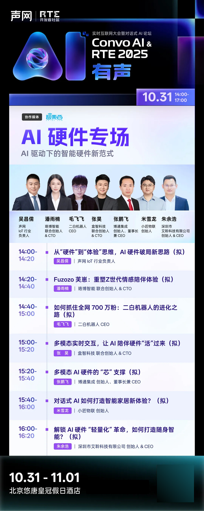 ConvoAI&RTE2025 AI硬件專(zhuān)場(chǎng)將聚焦三大核心方向,為行業(yè)提供 “從趨勢(shì)到落地” 的全鏈路價(jià)值: