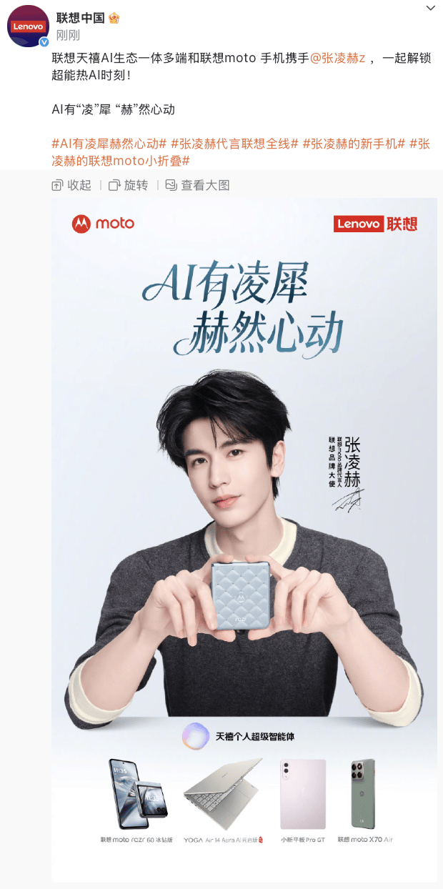 聯(lián)想官宣聯(lián)想品牌大使及聯(lián)想moto品牌代言人張凌赫,天禧個(gè)人超級(jí)智能體或?qū)⑷律?jí)