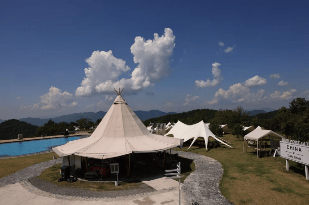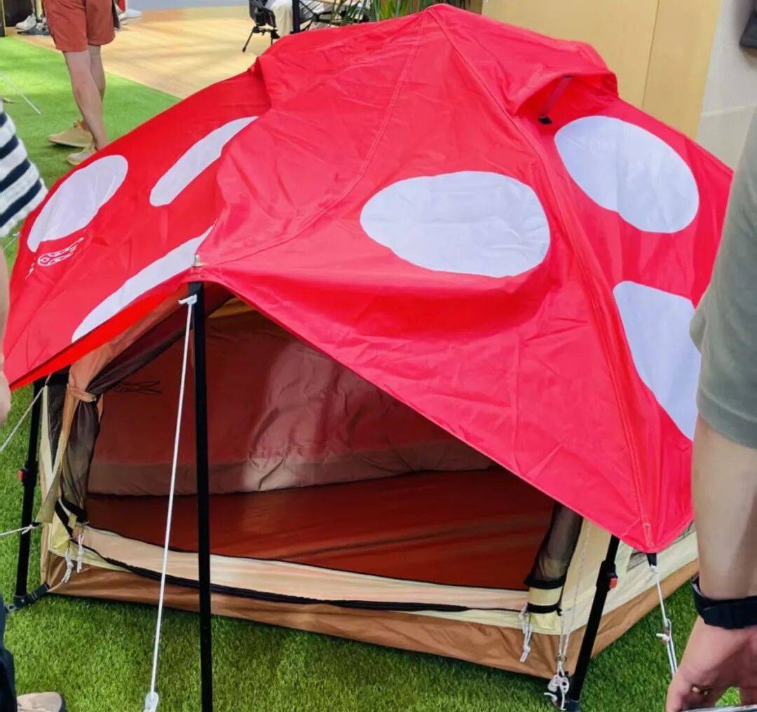義烏市宣聞戶外用品有限公司總經(jīng)理朱悅來還推出了蘑菇帳篷。一片草坪上,一個個帳篷搭在那里,無人機拉起來就像這座山上的一片自然長大的蘑菇。