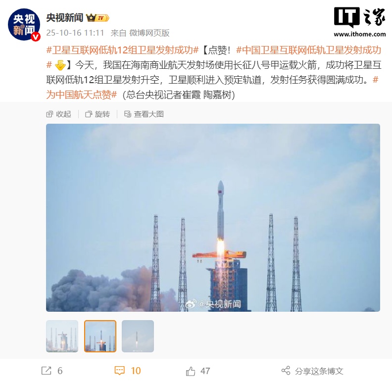 10 月 16 日消息,據(jù)央視新聞報(bào)道,我國今日在海南商業(yè)航天發(fā)射場使用長征八號甲運(yùn)載火箭,成功將衛(wèi)星互聯(lián)網(wǎng)低軌 12 組衛(wèi)星發(fā)射升空,衛(wèi)星順利進(jìn)入預(yù)定軌道,發(fā)射任務(wù)獲得圓滿成功。