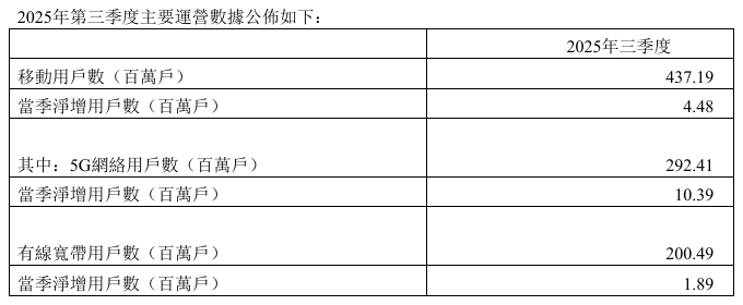數(shù)據(jù)顯示,2025年第三季度,中國電信移動用戶總數(shù)達(dá)到4.3719億戶,第三季度凈增用戶數(shù)448萬戶;5G網(wǎng)絡(luò)用戶數(shù)達(dá)2.9241億戶,本季度凈增1039萬戶;有線寬帶累計用戶數(shù)達(dá)2.0049億戶,本季度凈增189萬戶。