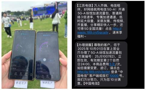 在數(shù)萬(wàn)人密集的音樂(lè)節(jié)現(xiàn)場(chǎng),率先加入體驗(yàn)的南京樂(lè)迷小李用5G-A網(wǎng)絡(luò)開(kāi)啟的高清直播全程無(wú)卡頓,“之前擔(dān)心人多網(wǎng)絡(luò)差,現(xiàn)在連4K畫(huà)質(zhì)都絲滑流暢。我剛拍下薛之謙的現(xiàn)場(chǎng)視頻,轉(zhuǎn)身就發(fā)了朋友圈,比身邊朋友快了足足半分鐘”。5G-A的飛速讓他成為朋友圈的“首評(píng)人”,此外,樂(lè)迷小李還有新發(fā)現(xiàn),他展示著手機(jī)上“電信場(chǎng)館VIP”的定制角標(biāo),這是辦理5G-A場(chǎng)館包后專屬的UE Logo標(biāo)識(shí)。 “真酷,太潮了!”