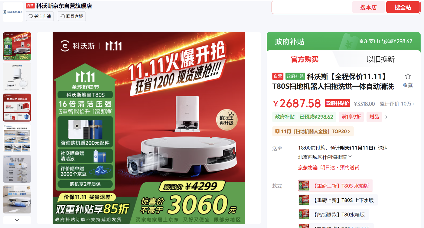 家中不止要除塵更要除污,科沃斯T80S掃地機器人能一次解決。搭載OZMO ROLLER 2.0恒壓滾筒活水洗地專利,200次/分鐘自清潔,實時刮走污水,杜絕以臟拖臟。16倍清潔強壓,干涸醬漬、奶漬一滾即凈。三重智能升降系統(tǒng),自動識別干濕區(qū)與地毯,及時抬升,避免二次污染;京東11.11下單雙重補貼享85折優(yōu)惠,到手價2688元。