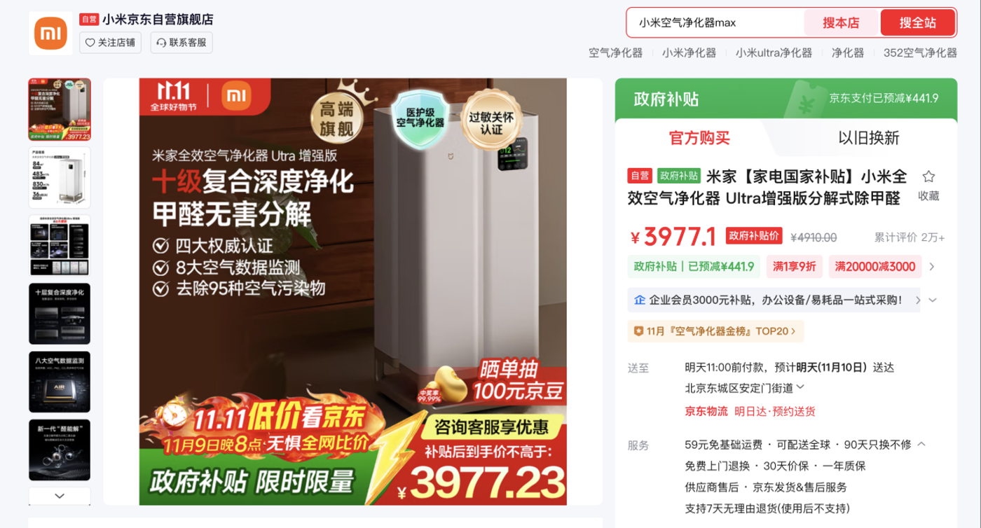 秋冬干燥,空氣中顆粒物增多,呼吸道更需呵護。小米全效空氣凈化器 Ultra 增強版,創(chuàng)新十級復(fù)合深度凈化,可有效分解甲醛、二手煙、除細(xì)菌、病毒等95種常見污染物,保持室內(nèi)空氣清新自然。京東11.11期間限時9折,疊加國家補貼8折,到手價3977.1元。