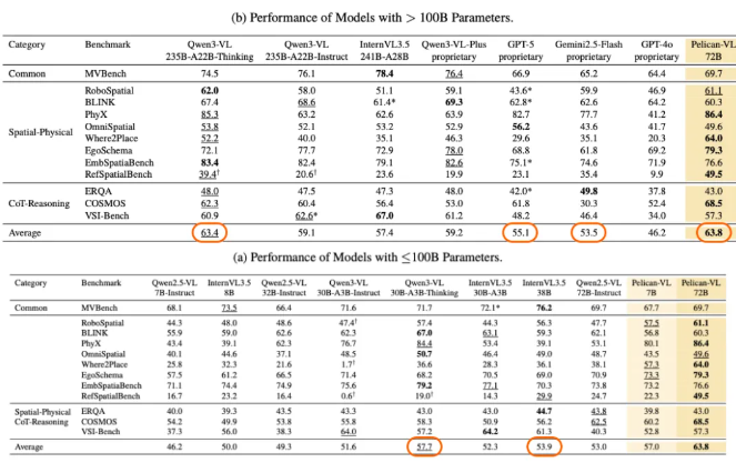 本次開(kāi)源的 Pelican-VL 1.0 的核心優(yōu)勢(shì)在于深度整合海量數(shù)據(jù)與自適應(yīng)學(xué)習(xí)機(jī)制,在由 1000+ A800 GPU 組成的集群上訓(xùn)練,單次檢查點(diǎn)訓(xùn)練耗費(fèi)超過(guò) 50,000 A800 GPU-小時(shí);團(tuán)隊(duì)從原始數(shù)據(jù)中蒸餾出的包含數(shù)億 token 的高質(zhì)量元數(shù)據(jù)以做訓(xùn)練基石;谏鲜鰞(yōu)勢(shì),Pelican-VL 1.0 實(shí)現(xiàn)了在基線基礎(chǔ)上性能提升 20.3%,平均超過(guò) Qwen3-VL 系列、InternVL3.5 系列等同級(jí)別開(kāi)源模型 10.6%。
