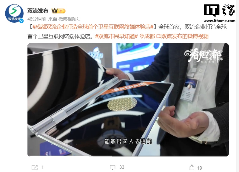 11 月 19 日消息,據(jù)“雙流發(fā)布”今日消息,成都迅翼衛(wèi)通科技有限公司(StarWin)“迅翼衛(wèi)通”衛(wèi)星互聯(lián)網(wǎng)線下體驗店于 11 月 18 日正式開業(yè)運營,這是全球首個衛(wèi)星互聯(lián)網(wǎng)終端體驗店。