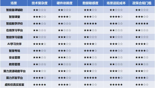 3. 梳理算力賦能教育行業(yè)典型應(yīng)用場(chǎng)景。“算力+教育”的應(yīng)用場(chǎng)景通過(guò)歸納主要分為四大部分,分別為教學(xué)場(chǎng)景、學(xué)習(xí)場(chǎng)景、管理場(chǎng)景以及科研場(chǎng)景,由于不同應(yīng)用場(chǎng)景之間存在差別以及技術(shù)層面的不同,因此不同場(chǎng)景的部署難度以及技術(shù)成熟度存在差異性。部署難度方面,不同應(yīng)用場(chǎng)景下,“算力+”的賦能模式需要結(jié)合技術(shù)復(fù)雜度、硬件依賴(lài)度、數(shù)據(jù)敏感度、場(chǎng)景適配成本以及政策合規(guī)情況進(jìn)行部署難度的判斷,對(duì)四大類(lèi)場(chǎng)景中的12個(gè)具體場(chǎng)景進(jìn)行多維度的分析。