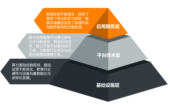2. 剖析算力+教育產(chǎn)業(yè)鏈各級(jí)特征。算力賦能教育產(chǎn)生的產(chǎn)業(yè)由基礎(chǔ)設(shè)施層、平臺(tái)技術(shù)層以及應(yīng)用服務(wù)層組成,其中主要企業(yè)包括教育信息化企業(yè)、互聯(lián)網(wǎng)企業(yè)、智能硬件廠商、電信運(yùn)營(yíng)商、ICT設(shè)備廠商、智慧教育產(chǎn)品開(kāi)發(fā)企業(yè)等多種類(lèi)型,不同類(lèi)型企業(yè)基于各自的技術(shù)優(yōu)勢(shì)和研發(fā)能力在算力賦能教育方向推出各類(lèi)產(chǎn)品以及服務(wù);A(chǔ)設(shè)施層,算力基礎(chǔ)設(shè)施向著“資源集中化”“場(chǎng)景智能化”“服務(wù)生態(tài)化”演進(jìn),硬件與設(shè)備正從單一性能競(jìng)爭(zhēng)轉(zhuǎn)向場(chǎng)景化、生態(tài)化、可持續(xù)化的綜合能力比拼。平臺(tái)技術(shù)層覆蓋范圍不斷擴(kuò)張,技術(shù)支撐能力持續(xù)增強(qiáng),并且不斷向集中化發(fā)展。應(yīng)用服務(wù)層,服務(wù)模式的不斷創(chuàng)新推動(dòng)教育應(yīng)用形式更加多樣化。