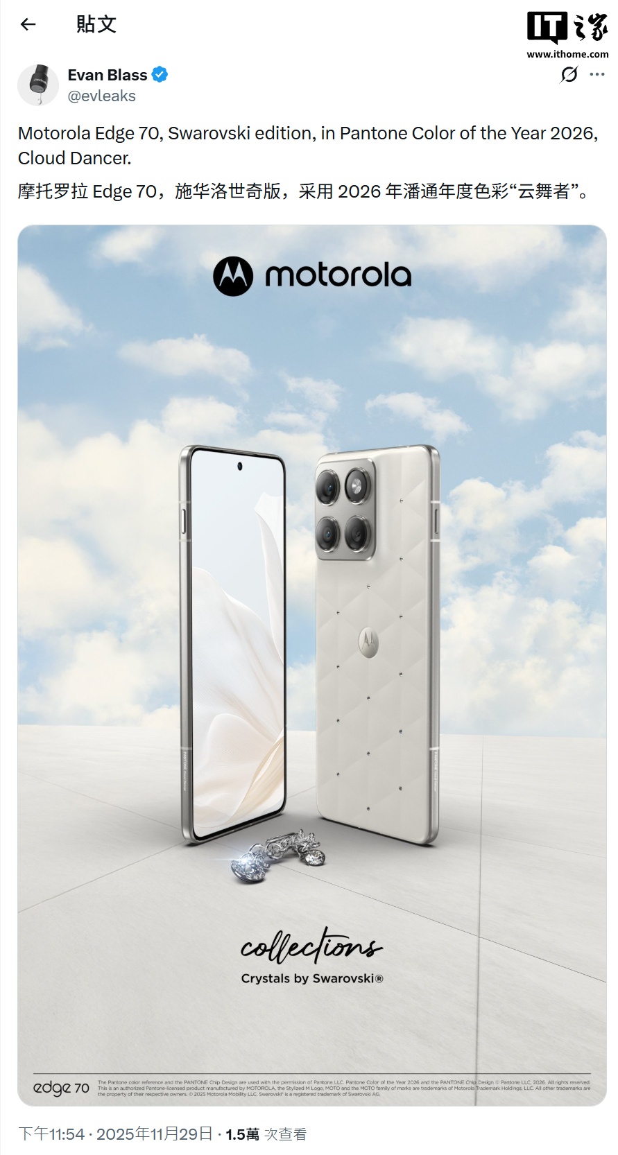 消息稱摩托羅拉即將推出施華洛世奇水晶版 Edge 70 手機,采用 Pantone 2026 年度代表色