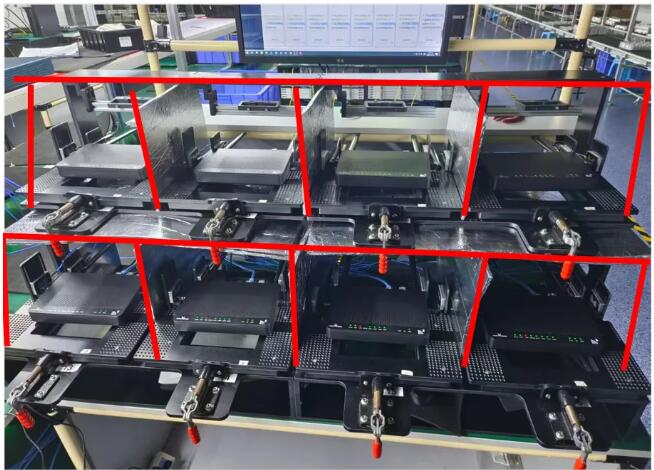 可制作兩個(gè)一拖八工裝搭建背靠背測(cè)試環(huán)境;1 拖 16 治具與流水線并放,員工站在流水線與測(cè)試桌之間操作;