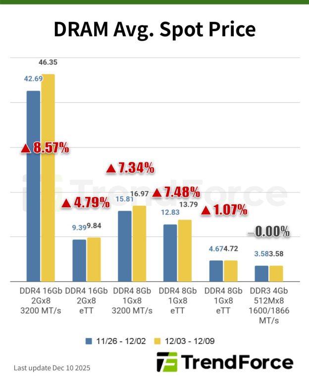 在 DRAM 市場方面,DDR5 與 DDR3 在過去幾周經(jīng)歷快速拉升后,本周迎來溫和回調(diào),主要來自部分現(xiàn)貨交易商的年底獲利了結(jié)操作。不過,這一調(diào)整并未改變整體供應緊張的市場格局。