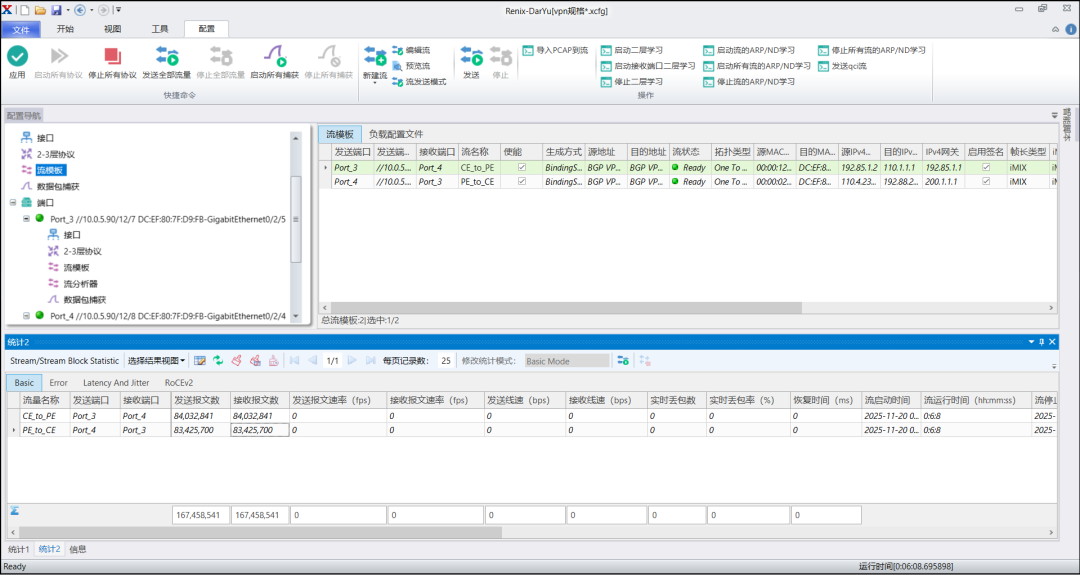 搭建簡(jiǎn)化的測(cè)試場(chǎng)景,在一對(duì)端口上模擬測(cè)試1000個(gè)MPLS IP VPN,每VPN通告100條VPNv4路由,并震蕩其中10%路由。發(fā)送iMIX流量驗(yàn)證VPN轉(zhuǎn)發(fā)能力。