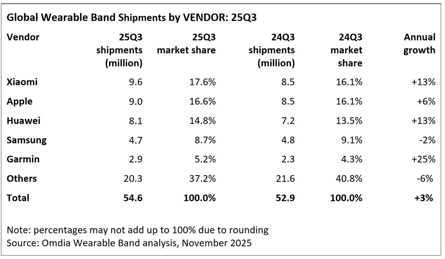 Omdia 報告 2025Q3 全球可穿戴腕帶設(shè)備出貨量:小米同比增 13%、蘋果增 6%、華為增 13%、三星降 2%、佳明增 25%