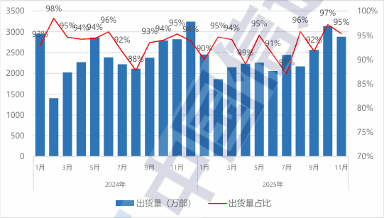2025 年 1-11 月,國(guó)產(chǎn)品牌手機(jī)出貨 2.41 億部,同比增長(zhǎng) 1.2%,占同期手機(jī)出貨量的 85.4%;國(guó)產(chǎn)品牌上市新機(jī)型 451 款,同比增長(zhǎng) 15.6%,占同期手機(jī)上市新機(jī)型數(shù)量的 95.1%。