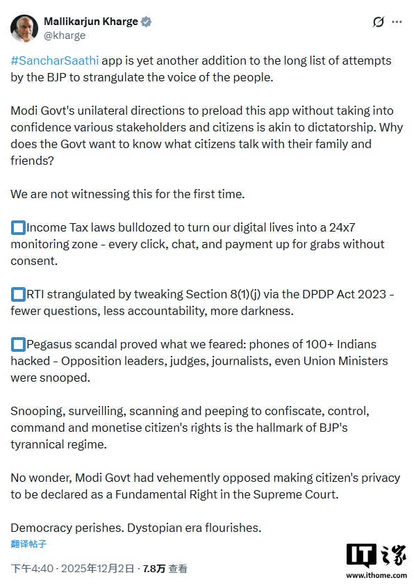 此項強制安裝令此前引發(fā)強烈爭議。反對黨國大黨領袖馬利卡瓊・卡爾格(Mallikarjun Kharge)周二在 X 平臺上發(fā)文稱,此舉將導致“窺探、監(jiān)視、掃描和偷窺”,并形容其“近乎獨裁”。