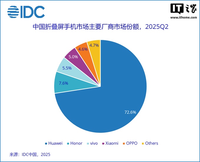 IT之家注意到,2025 年第二季度中國(guó)折疊屏手機(jī)市場(chǎng),華為保持強(qiáng)勢(shì)表現(xiàn),占據(jù)超過(guò) 70% 的市場(chǎng)份額;榮耀在新品發(fā)布之前依然在折疊屏手機(jī)市場(chǎng)保持第二位,份額 7.6%;大折疊 X Fold5 系列幫助 vivo 重返市場(chǎng)第三位,市場(chǎng)份額 5.5%;小米依靠市場(chǎng)近期唯一的小折新品位居市場(chǎng)第四位;Find N5 上市最早,但是依然受到消費(fèi)者青睞,使得 OPPO 保持市場(chǎng)第五位。