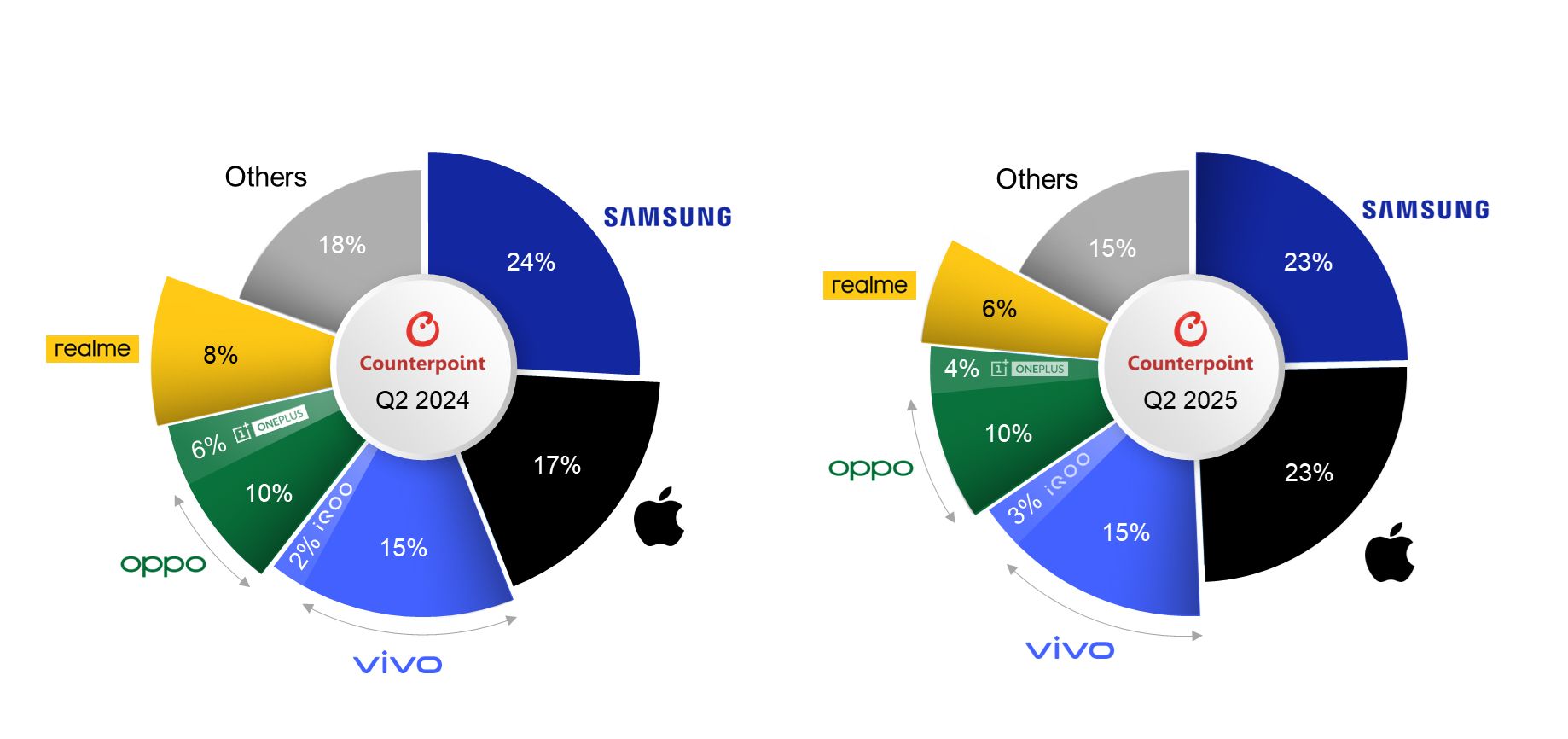 Counterpoint 報告 2025Q2 印度手機(jī)市場:vivo 20% 出貨量第一、三星 23% 出貨額居首,iPhone 16 機(jī)型出貨量最高