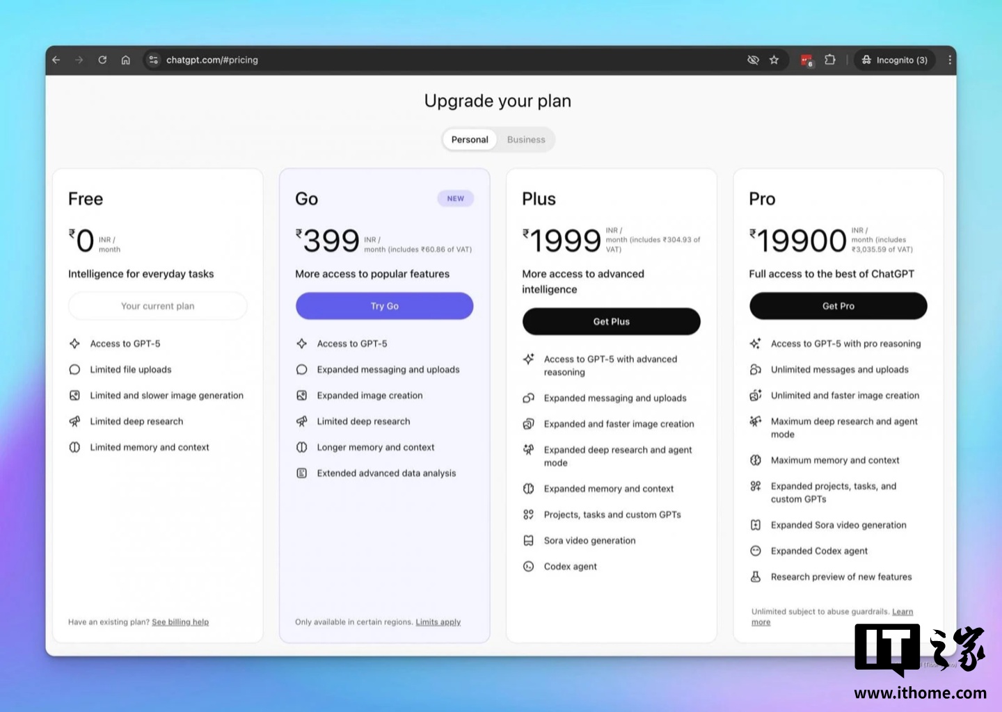 OpenAI 推出“ChatGPT Go”低價(jià)套餐:僅限特定地區(qū),每月 399 印度盧比