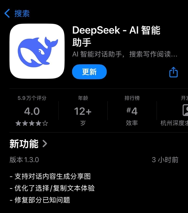 根據(jù)手機(jī)應(yīng)用商店顯示,DeepSeek App今天發(fā)布了1.3.0版本更新,支持對(duì)話內(nèi)容生成分享圖功能。